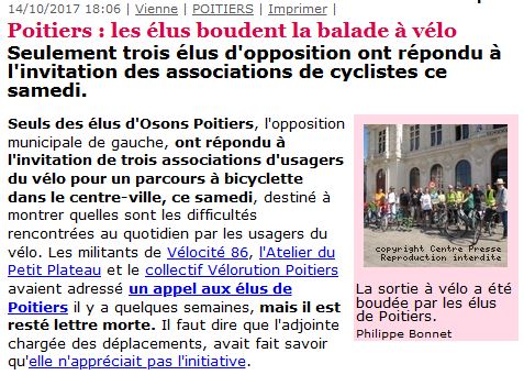 Nos élu-e-s ont ainsi participé à la quasi-totalité des actions de sensibilisation au vélo proposées par les associations locales (surtout Vélocité 86).