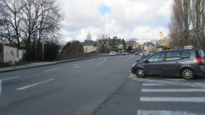 - Des équipements visuels et matériels (marquage au sol de couleurs, indication de priorité des cyclistes par rapport aux voitures) aux abords des intersections et ronds-points : trop souvent relégués à l’extérieur de ceux-ci, les dangers pour les cyclistes sont actuellement très importants (dépassements, queues de poissons…)