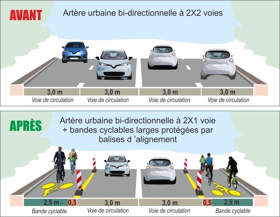 Transformer les 2×2 voies (boulevards circulaires, le quartier de la gare, la pénétrante, l’accès au CHU…) en 2×1 en modifiant les voies gagnées en pistes cyclables et en élargissant les trottoirs